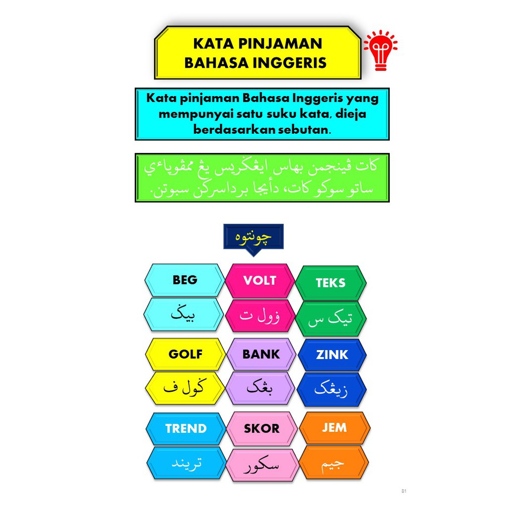 Kata dasar boleh terdiri daripada satu suku kata ekasuku dua suku kata dwisuku tiga suku kata trisuku atau lebih daripada itu. Masukkan nama orang nama yang bukan dari bahasa arab nama negara nama kota nama desa maupun nama lain yang ingin di tulis kedalam tulisan arab. Contohnya terdapat dalam sebuah buku kecil yang berjudul Suluhan Mubtadi oleh Haji Daud Haji Ahmad Kelantan 1953 hlm.